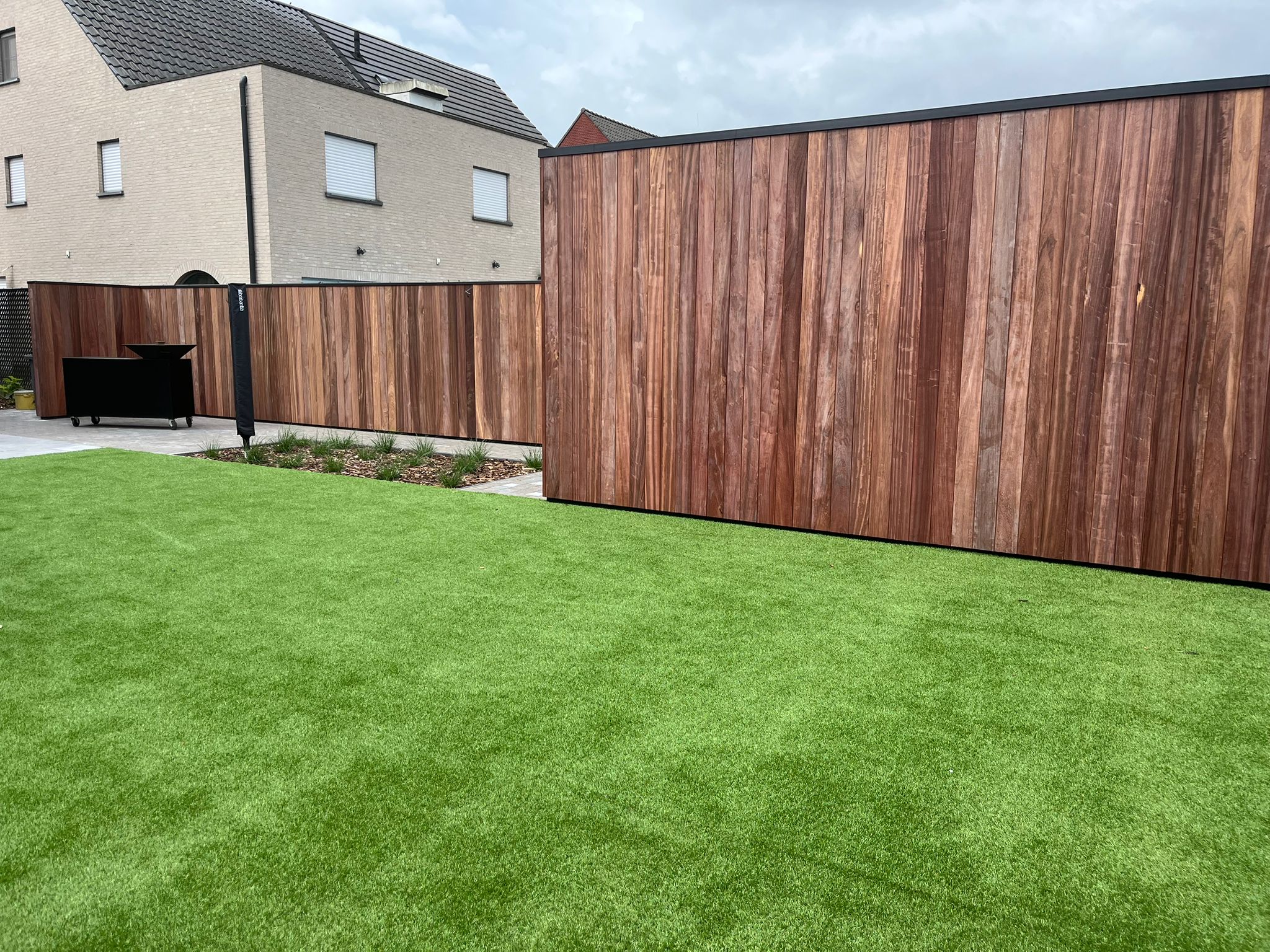 Een stijlvol tuinhuis met bijpassende tuinmuur in padoek. Duurzaam, strak afgewerkt en perfect geïntegreerd in de tuin.